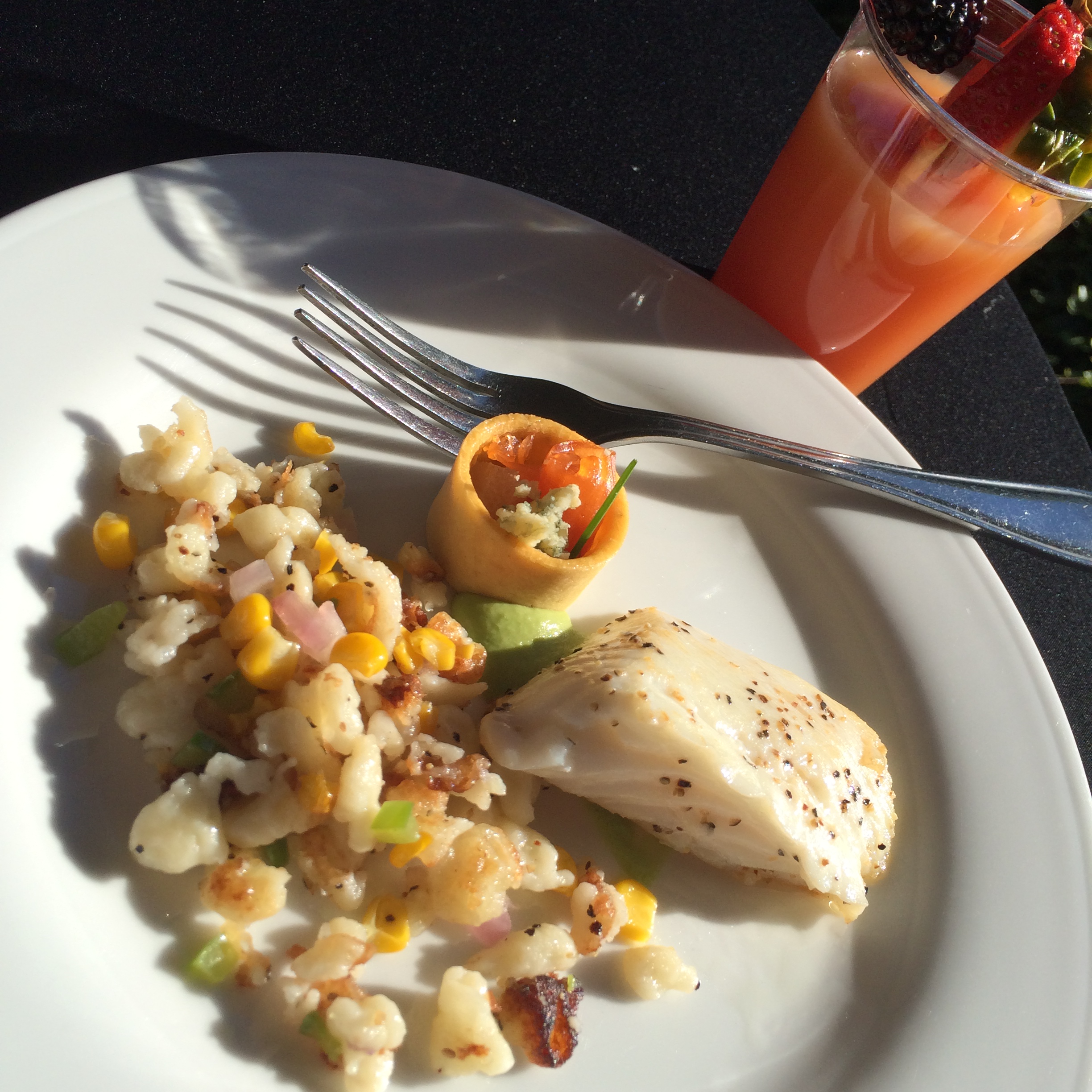 Next stop was at the adjacent Marriott Vancouver Airport, their award winning restaurant The American Grille served a Tasting Plate of house cured Gravlax of Salmon, Roasted BC Halibut, Spaetzle, corn succotash and green pea puree with a Poached Anjou Pear on Stilton crumble tart. Their plate was paired with a Tasting Cup; Peach Breeze, a fresh and fruity combination.