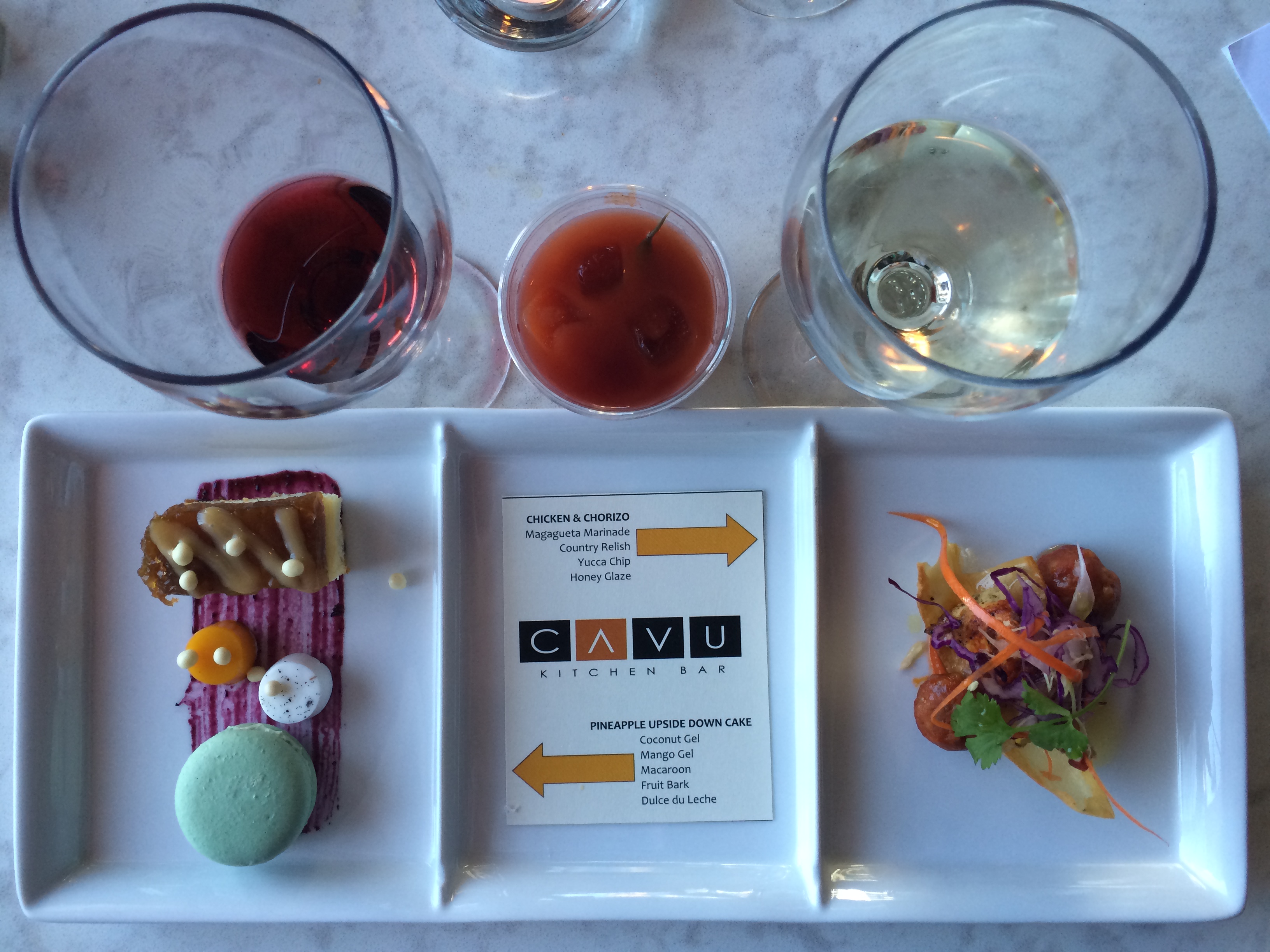 Completing the trio of hotel restaurants within the block, the Hilton Vancouver Airport is home to the newly renovated CAVU Kitchen Bar, guests were greeted by a cool palate cleanser of Sour Cream Panna Cotta with local blueberries and a zesty wine Caesar. Following closely by a glass of Stone Road Chardonnay or Meritage and a Tasting Plate of two halves; hot side was Chorizo & Chicken with pepper, country relish, yucca and a honey glaze and on the cold side was a Pineapple Upside Down Cake with coconut & mango gel, and a maracon.