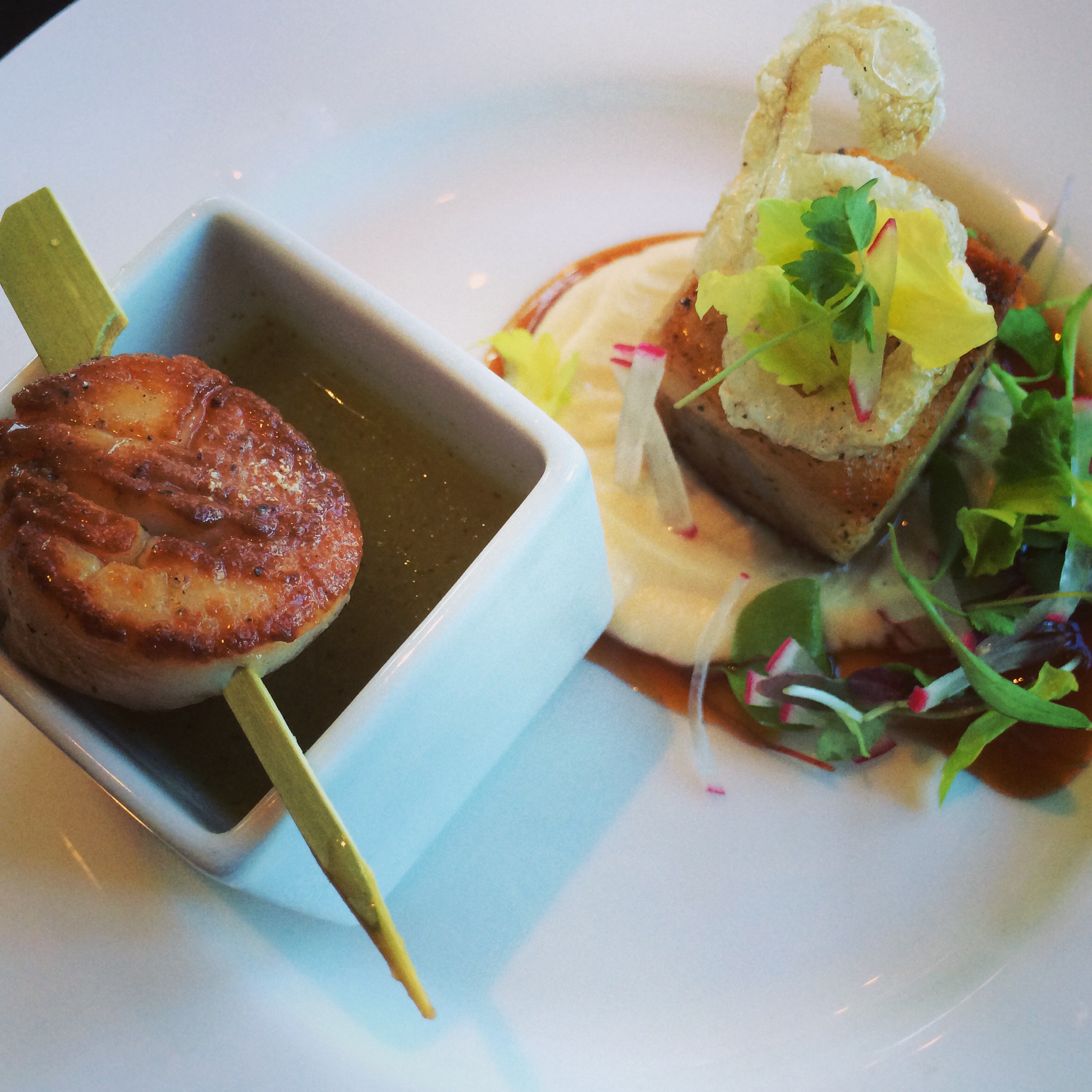 served up a Tasting Plate of Honeydew and Calamansi Gazpacho, with a Tamarind seared Scallop – a cool and cleaning starting taste, then a sous vide Pork Belly atop Parsnip mashed with White Chocolate.