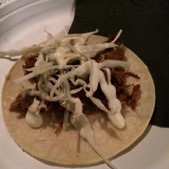 Bitter Tasting Room served a Taco of Barbecue Pulled Pork, Fresh Cut Slaw, Pepperoncini Aioli
