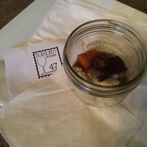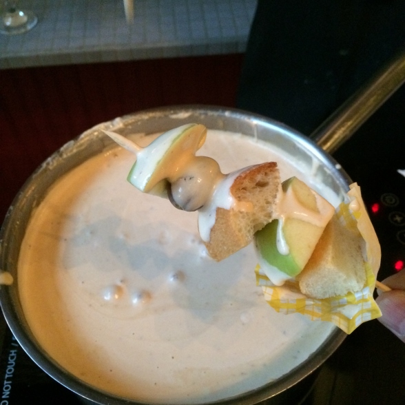 Across the street Burgundy Restaurant, guests were welcomed with a sample of Rustico Winery’s Pinot Gris before we took trip to each of the three food stations around the room. First was a hearty goat cheese fondue with crisp apples and bread, followed by a slow cooked beef bourguignon and lastly a choice of chocolate mousse or Orange Galliano Sorbet