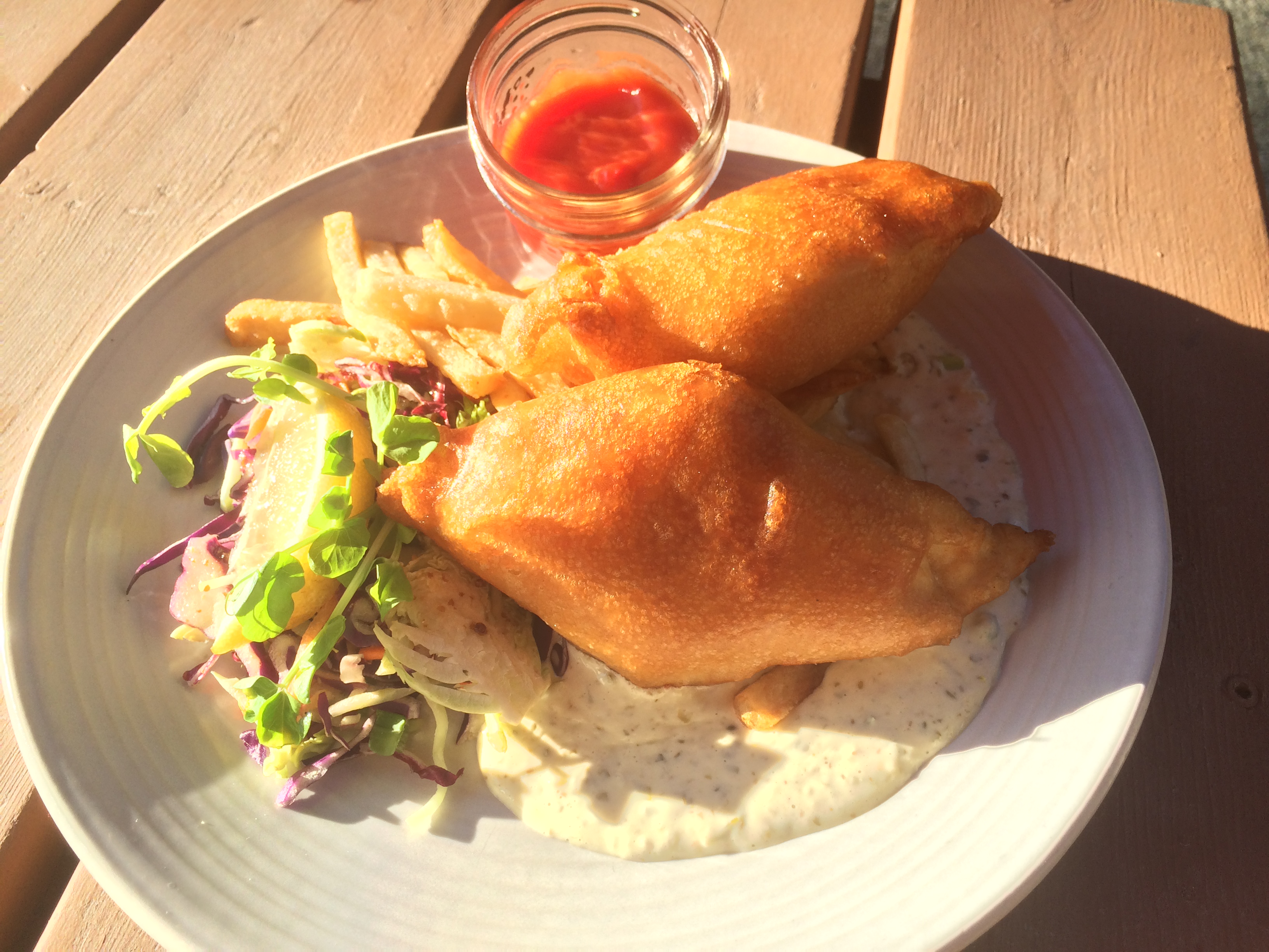 The outdoor cafe menu is a collection of casual fare that suits the outside dining. I choose a solid plate of fish and chips served with a tasty house made cole slaw, Billy had prawn and clam linguini with an ample amount of seafood but also a bit much olive oil. Both dishes were satisfying after a day at the beach.