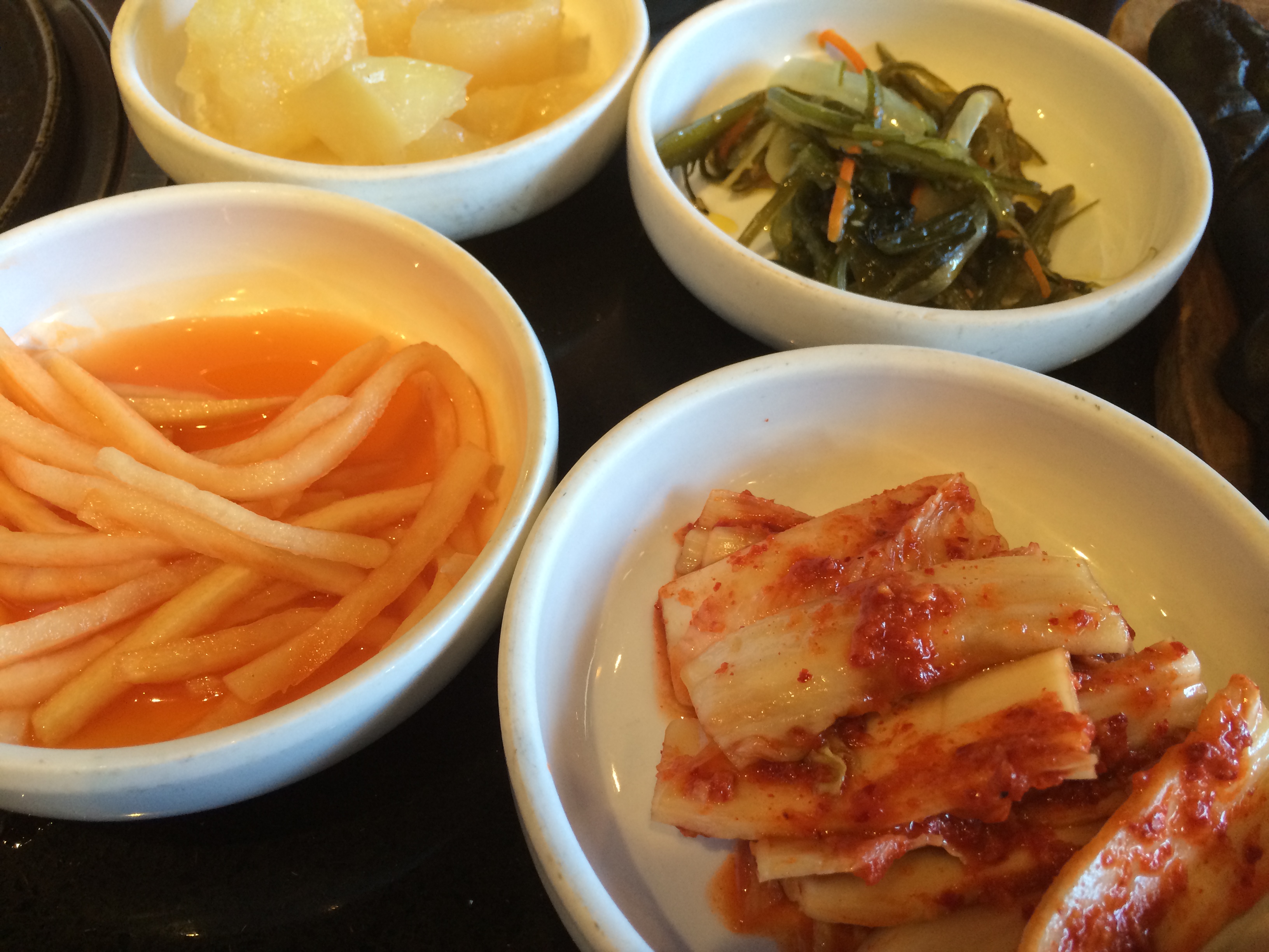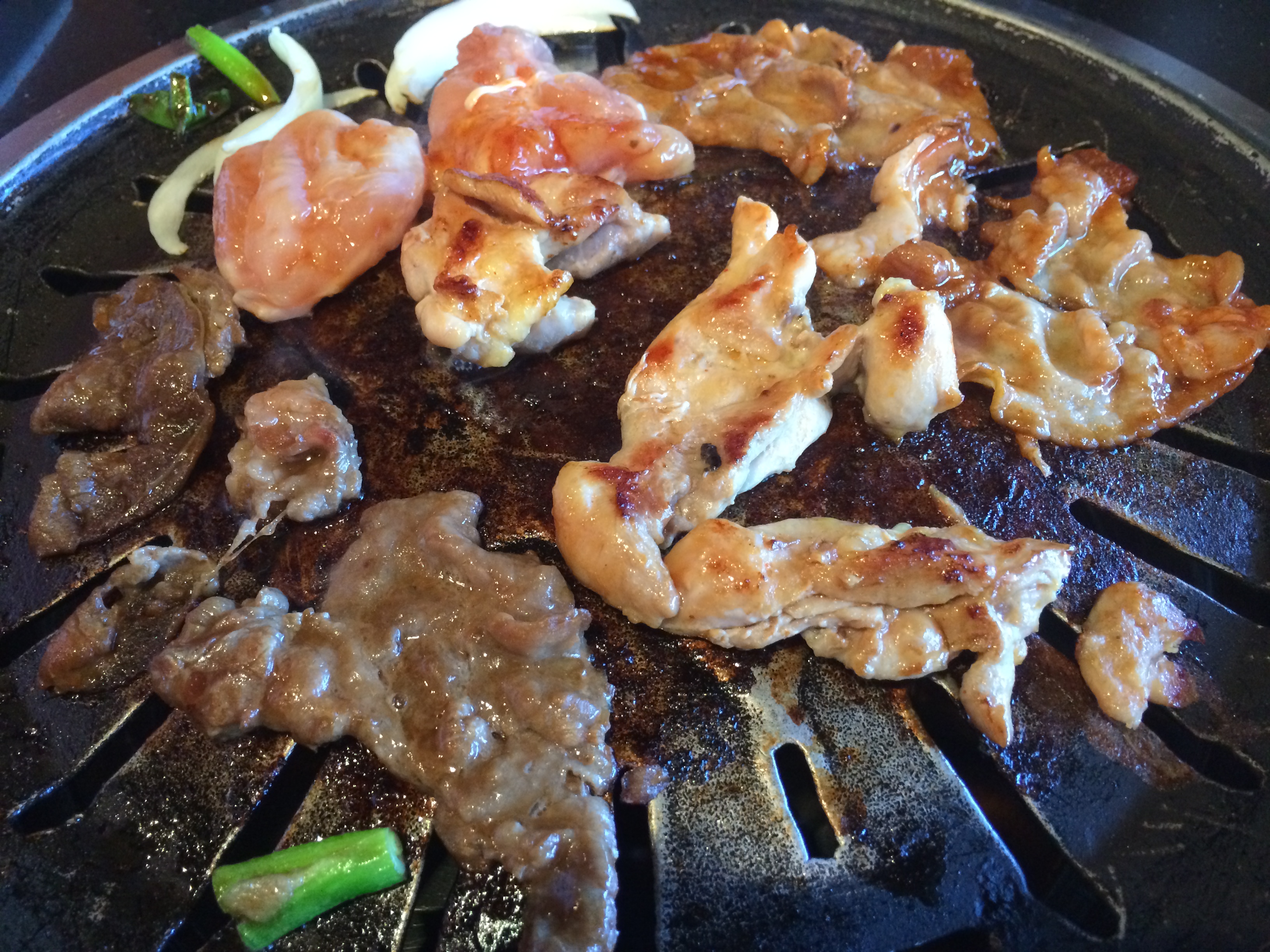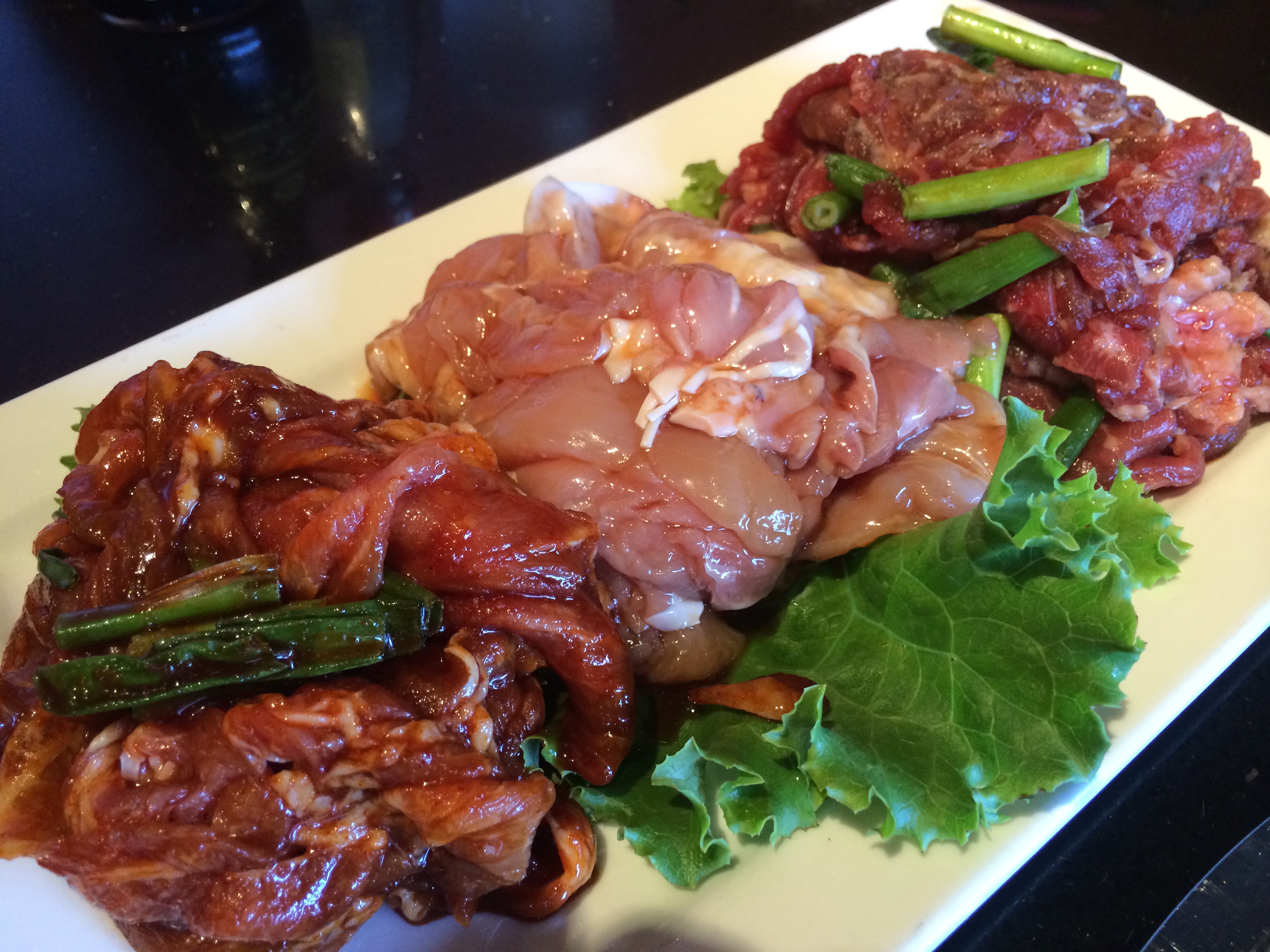 In the midst of strip malls and commercial businesses on Kingway, Chosun Korean BBQ is a tasty cultural oasis. A nicely decorated restaurant awaits patrons with each table having a bbq grill (bul pan) as the centrepiece. As with most Korean BBQ restaurants the menu can be overwhelming for a newcomer to know which meat(s) to pick from but the Chosun menu seemed to be broken down simply, at least at lunch when we attended. The Lunch BBQ combo make it easy to choose, two combo options; Combo A – Beef, Chicken & Pork Bulgogi (marinated meat) for $15.95 or Combo B – Galbi (beef short rib), Chicken Bulgogi, Pork Belly & Beef Tongue for $18.95. We choose Combo A and the staff fired up the grill for us to start grilling. The traditional Korean condiments of Kimchi, pickled radish, potato and seaweed compliment the flavours of the BBQ.
