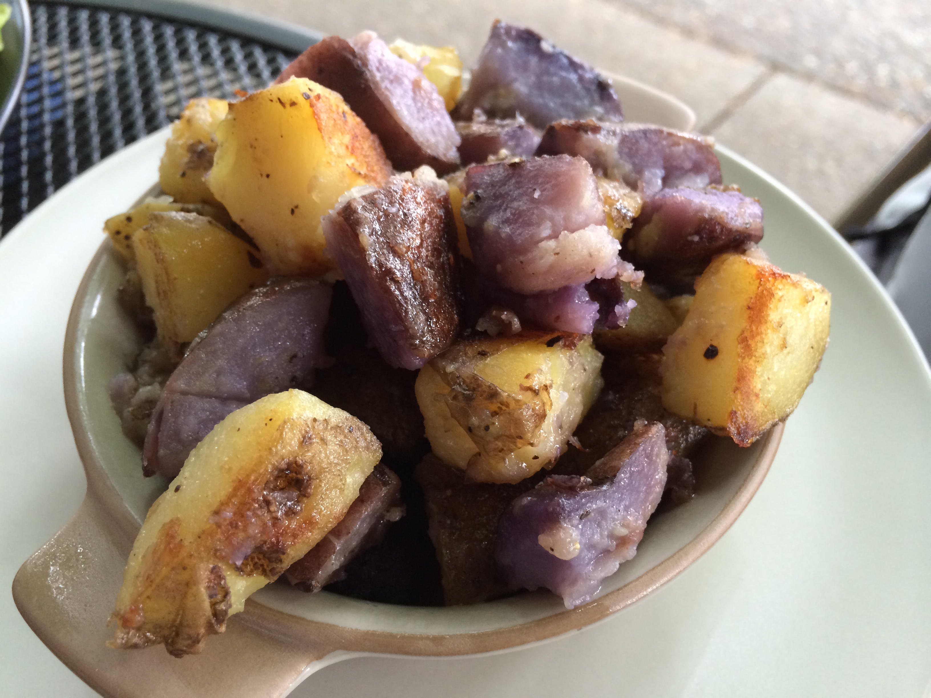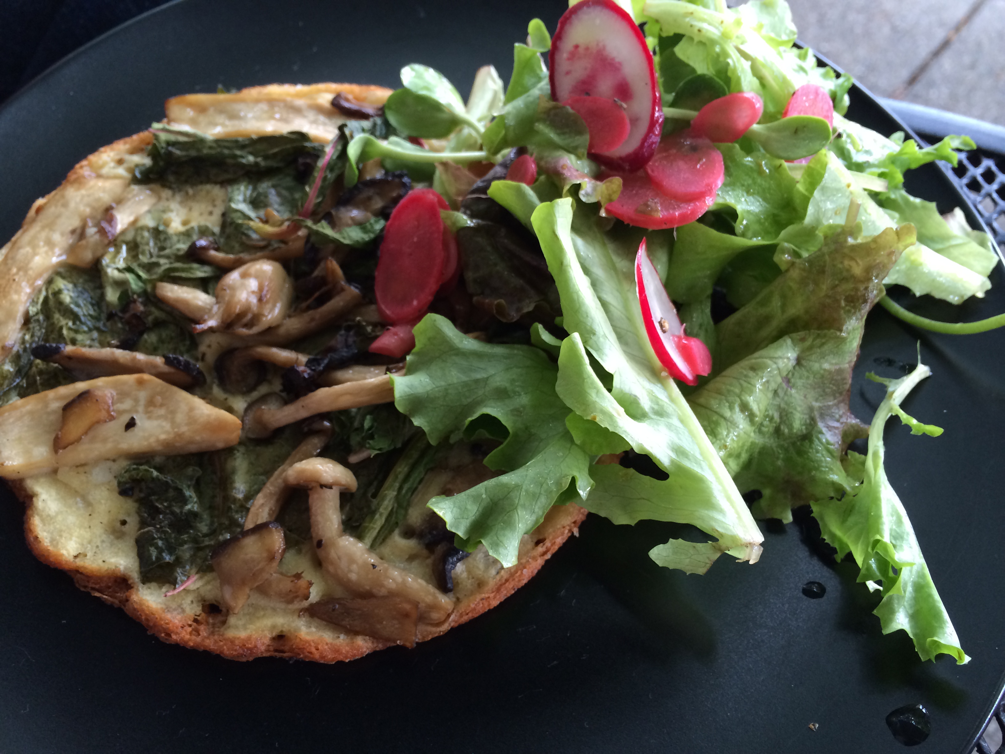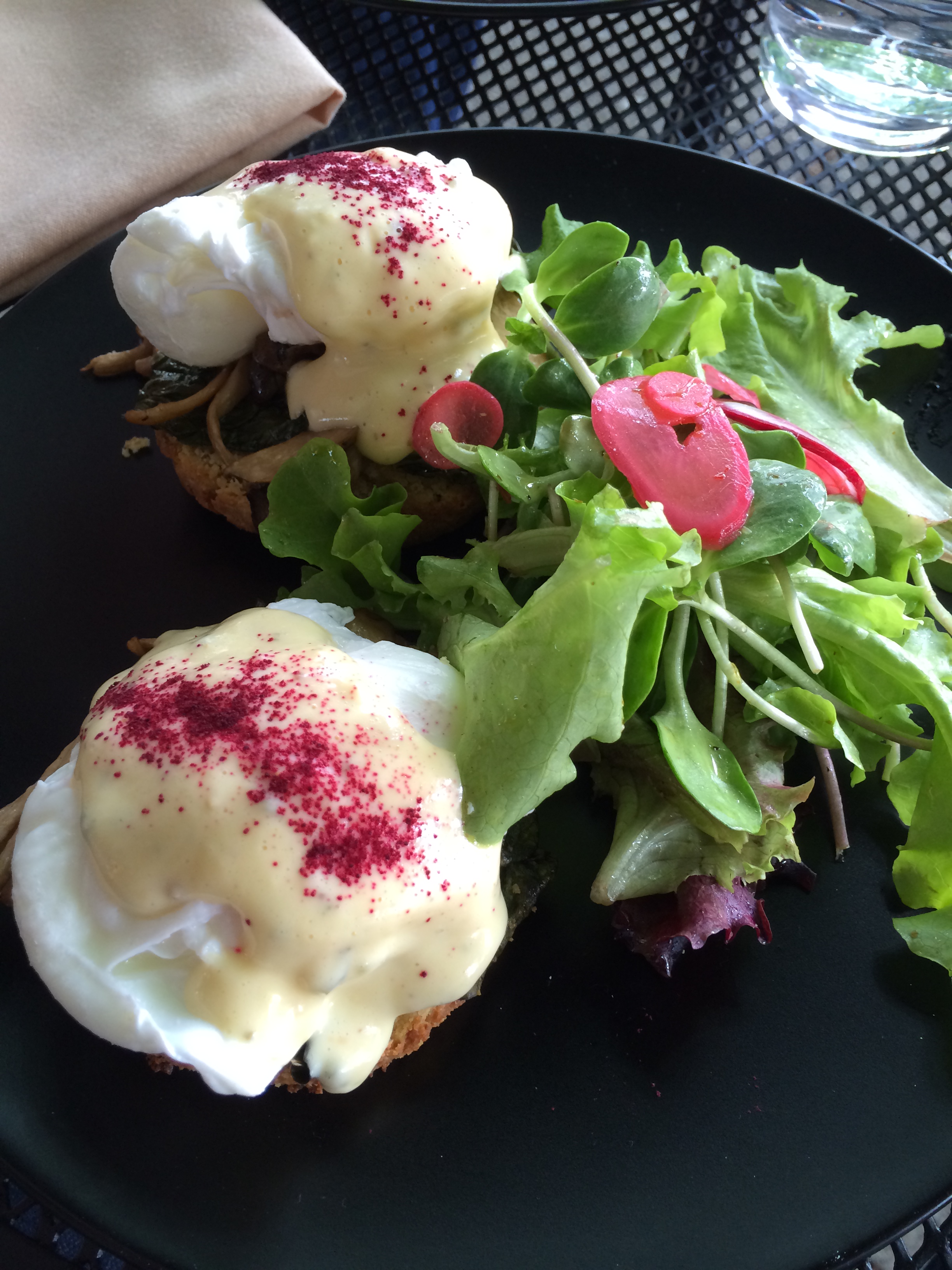I recently visited for brunch with my friend Michael (@vegandall) choosing to sit outside on a nice spring day, the fresh air balancing the fresh ingredients. I choose the gluten-free breakfast biscuit benny; a pair of nicely poached eggs with wild kale and mushrooms, sitting atop a flakey rusk-style, gluten-free biscuit with a yoghurt based hollandaise sauce. A nice balance between the flakey biscuit and the egg yolks and hollandaise. Michael opted for the Farinata, an eggless omelette alternative made with chickpea flour, topped with mushrooms, shallots, and juniper aioli (cheese can be added if you don’t want to keep it vegan). The Farinata was more of a flatbread or frittata style than a classic folded omelette but all the flavours worked to create a satisfying breakfast. A side of multi-coloured potatoes sauteed in olive-oil added a simple addition to round out the brunch.