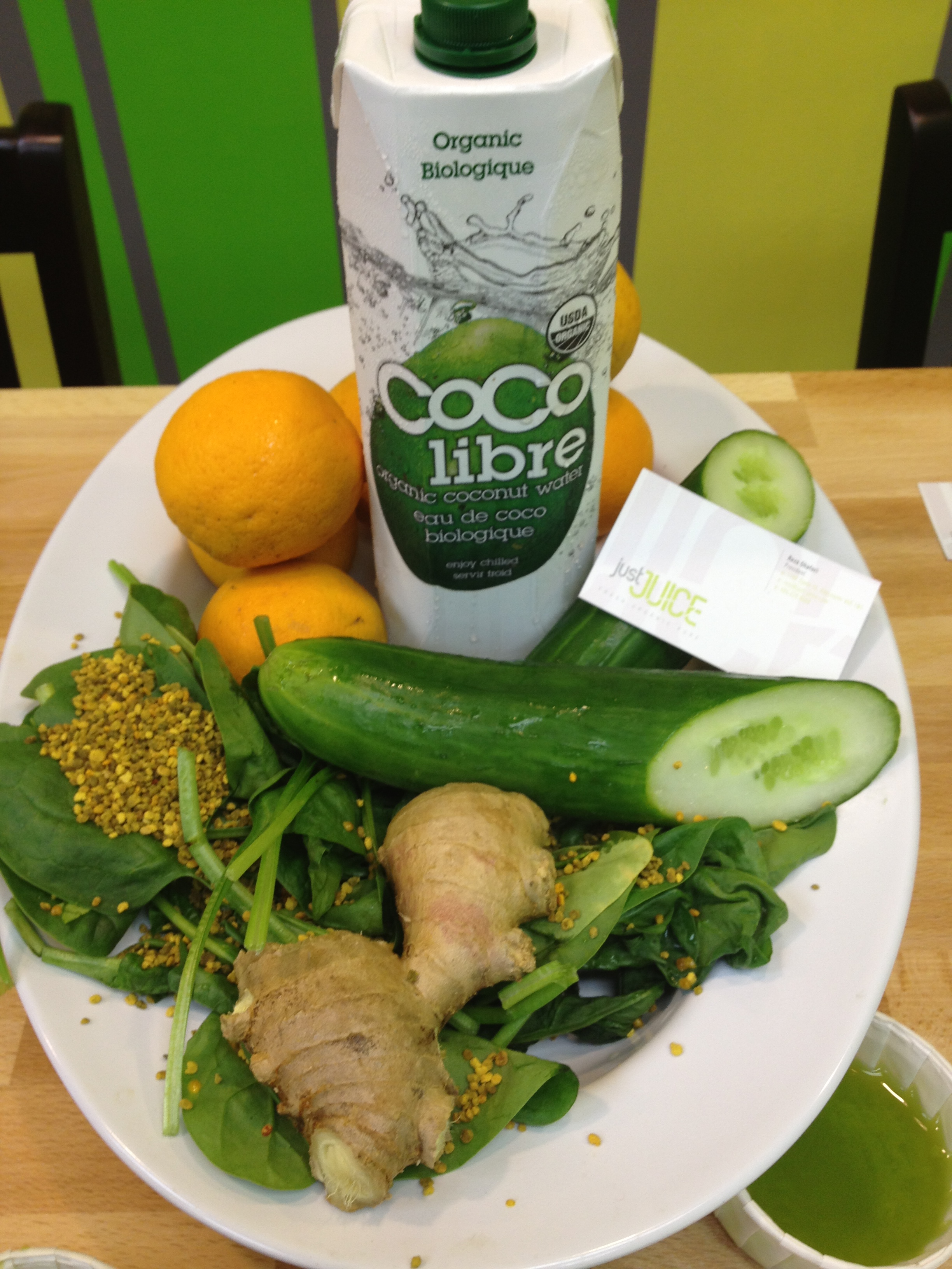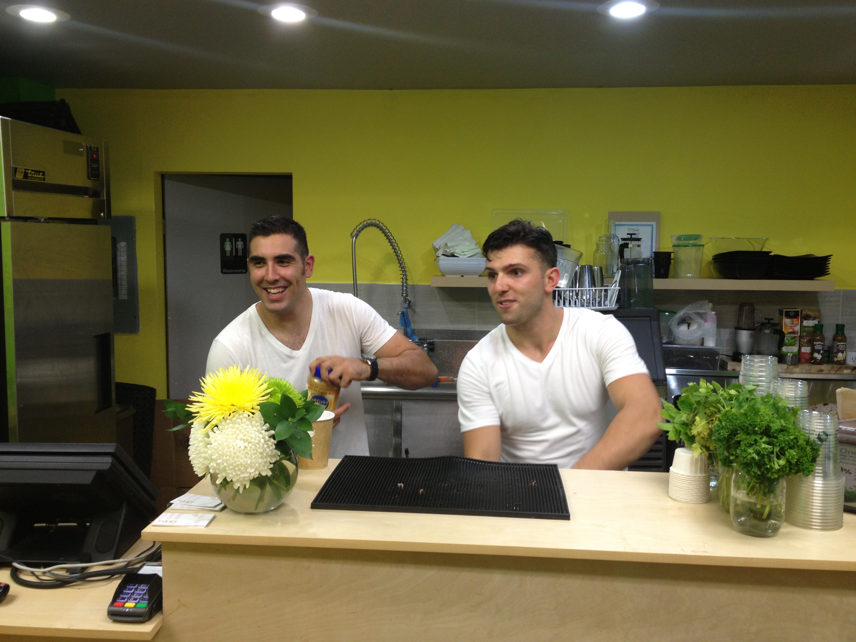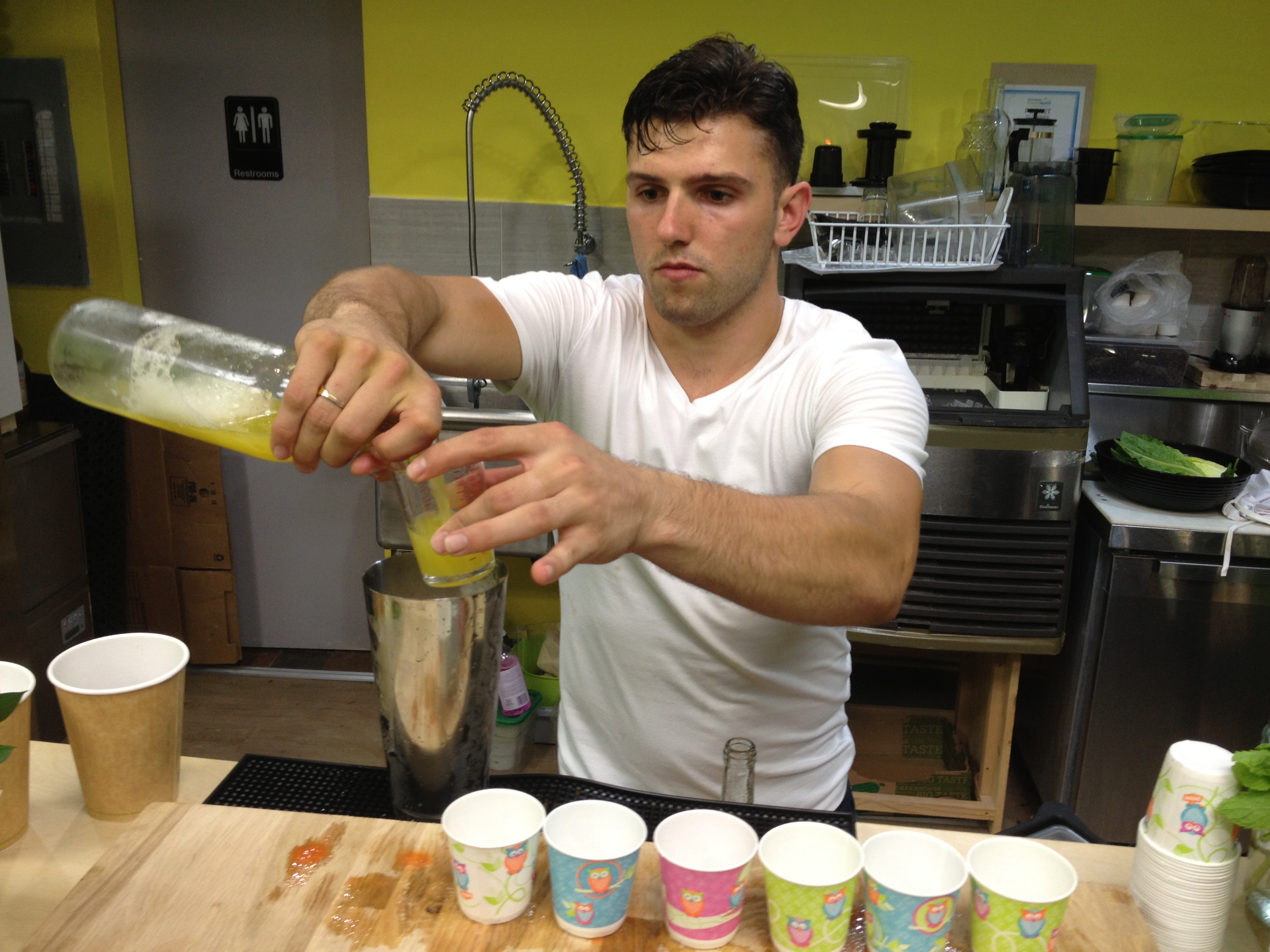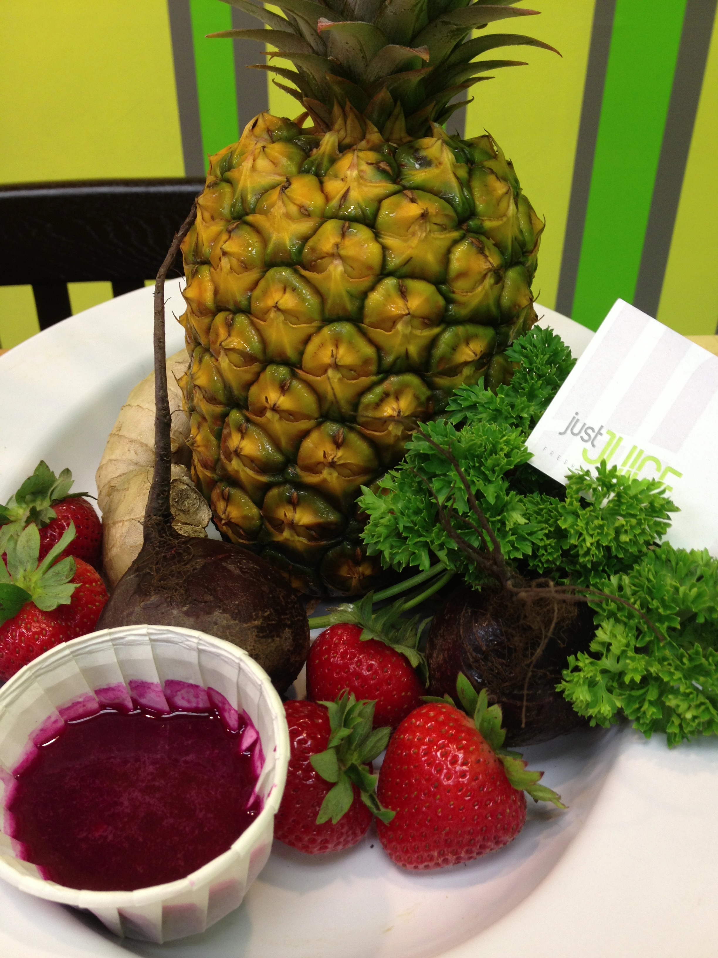 There is a lot of talk of the health benefits of juicing in the media and from healthy living advocates but many people, like me, may not know where to begin with their fruit and vegetable combinations. That’s where owners Reza Ghafori and TJ Cooke come in, their backgrounds in kinesiology, health and fitness combined with a bartending experience make them the perfect guys behind the Just Juice Bar. While TJ mixes the juice cocktails and smoothies he enthusiastically extolls the virtues of the combined ingredients will have on your well-being.
