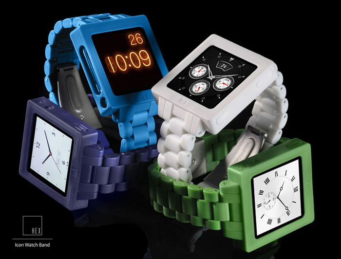 Hot on the heels of Apple’s announcement confirming the iPod nano form is staying as is for at least another generation HEX introduces its new line of Icon watch bands. Created in a vibrant range of custom polycarbonate, the HEX Icon watch bands and the iPod nano combine to create the perfect accessory. The matte finish Icon line comes in five colors including blue, green, purple, white and black and have a ceramic-like texture.
