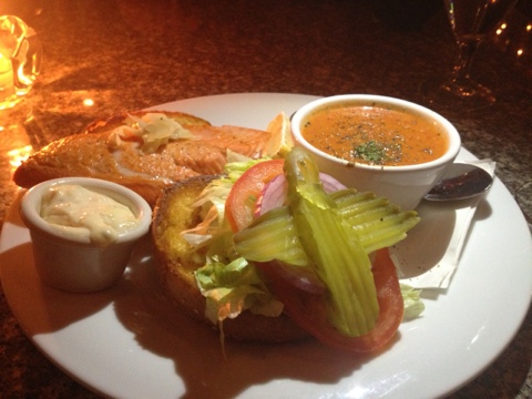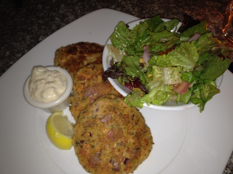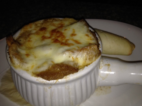 The chef receives good grades! Starting off my friend and I shared the Salmon & Crab Cakes, 3 large (3″) cakes which were almost totally void of filler, just salmon, crab and a small hint of green onion, red peppers and light herbs. Served with a very nice house-made tartar sauce and a fresh side salad of greens, herbs, cheese and local hazelnuts it was large enough to be an entree for a single person. My friend’s starter French onion soup was equally filling and substantial, a hearty