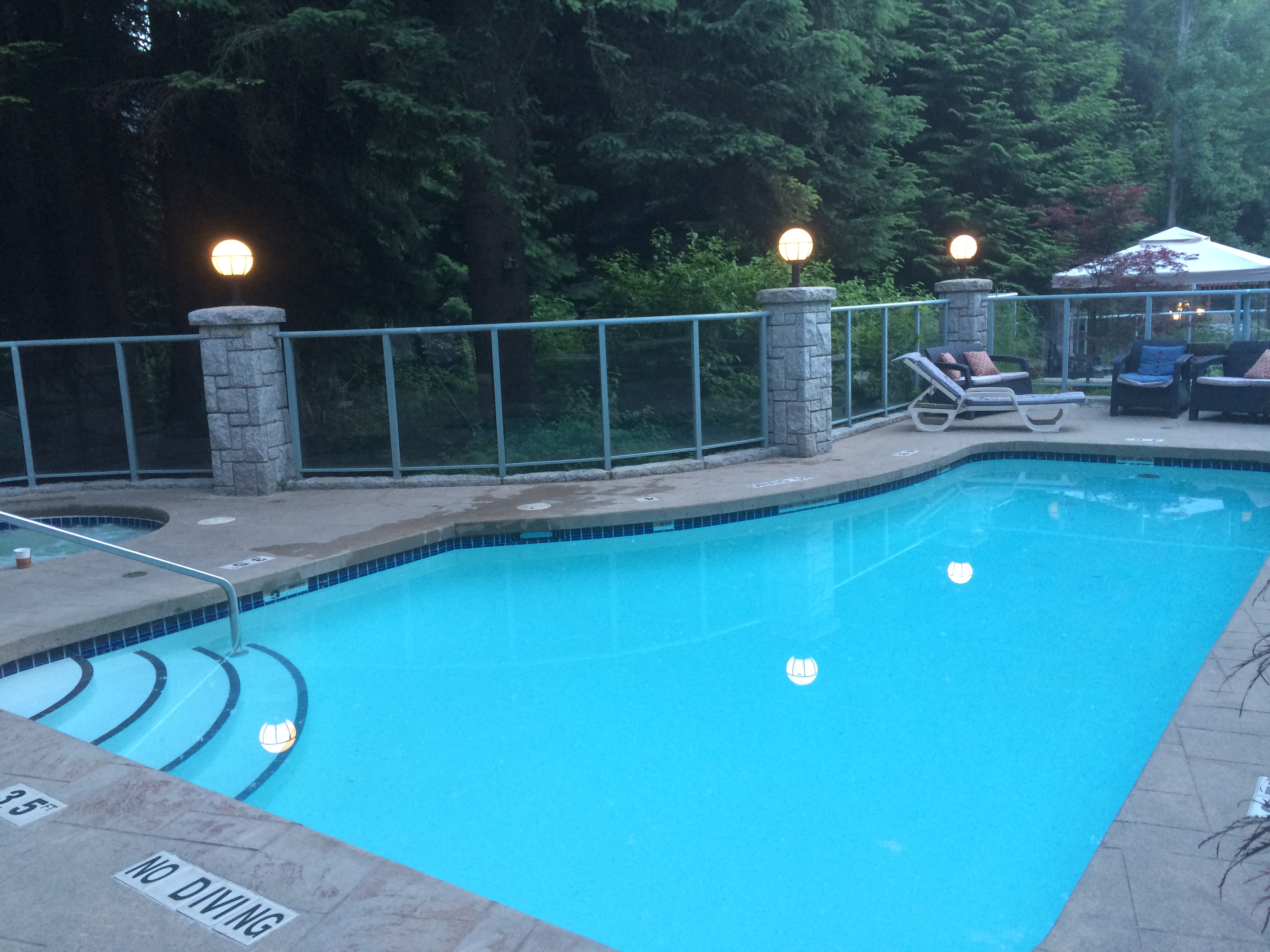 Off the lobby, adjacent to the Taman Sari Royal Spa, the only authentic Javanese Spa in North America, the indoor sauna leads to the hot tub and swimming pool. Summit Lodge backs on to Village Park so the pool and hot tub are fairly secluded, only overlooked by the hotel’s rear facing rooms meaning soaking up the afternoon sun means looking out at evergreen trees.