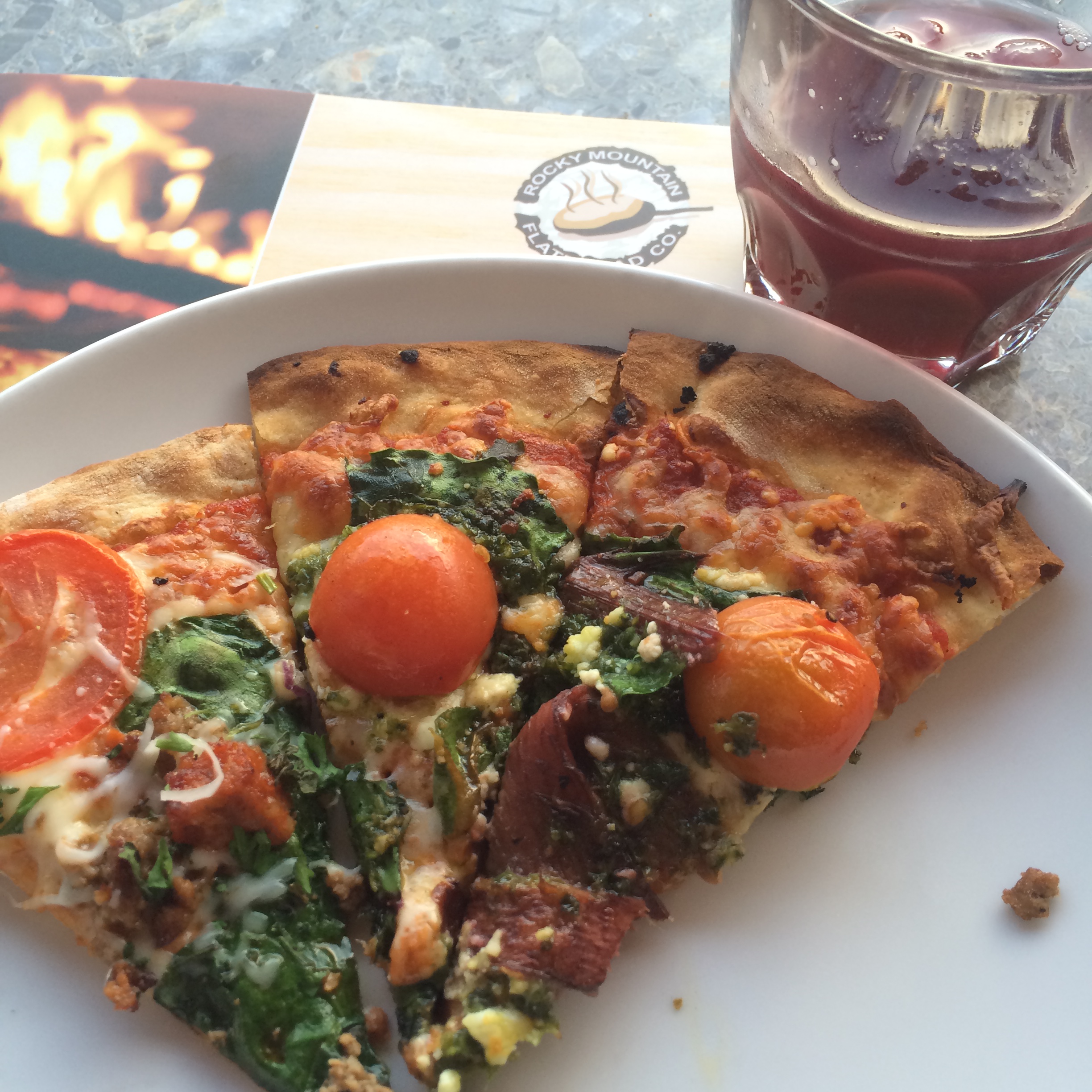 Al fresco pizza was the order at Rocky Mountain Flatbread Co. Crispy crusted Farmers Market Pizza was topped with balsamic marinated rhubard and chard, pesto and goat cheese. The Naturally Meaty flatbread offered up spicy beef, Italian sausage, veggies and asiago cheese.