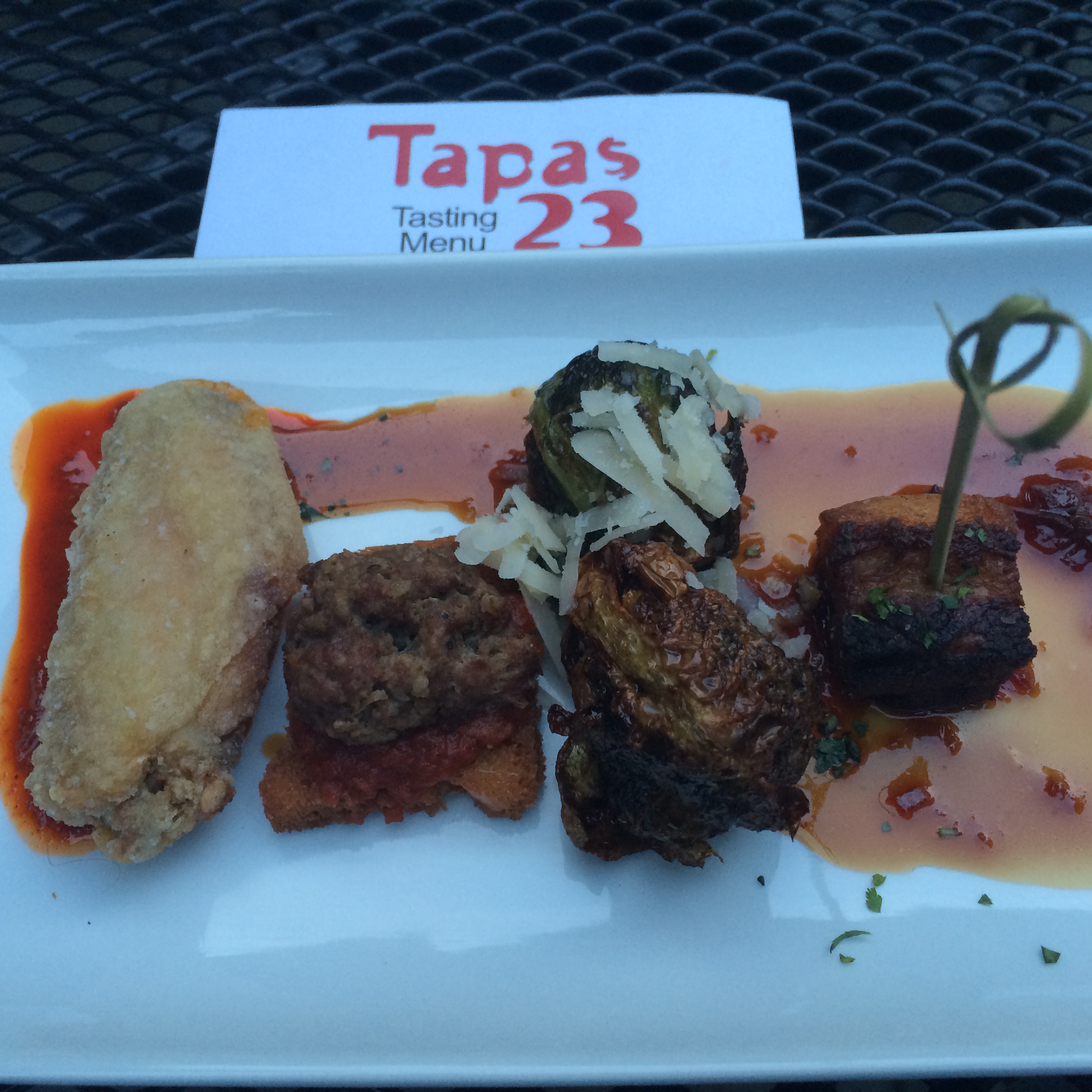 Back to the beginning, we returned to Tapas 23 to close off the evening. Seated in a beautifully, landscaped, patio in the back of the restaurant, serenaded by live guitar music and served great tapas it was an amazing oasis on busy Main Street. The Tasting Plate included; Braised Pork ‘Bombas’, Potato crusted chicken wings, Bruselas (crispy, cooked brussell sprouts) and Albondigas (meat ball with roasted red pepper and sundried tomato).