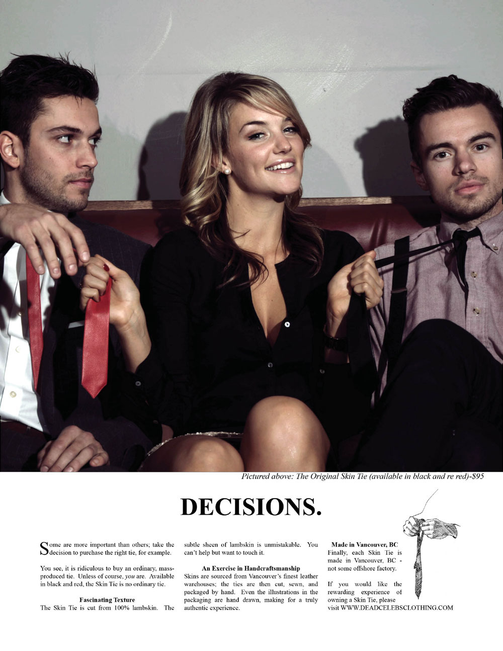Inspired by the skinny leather ties from the 80’s, The Skin Tie is a luxury lambskin edition. The 80’s template was often made with thick, stiff leather and shorter than today’s version. Each of The Skin Ties is created from 100% lambskin, hand-cut and hand-sewn in Vancouver by Dan and his seamstress, mother. Taking a page, literally, from retro magazine advertising of the sixties the imagery for the line is as stylish as the ties themselves. The packaging also allows MacDonald’s artistic side to surface with his