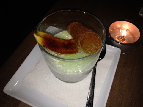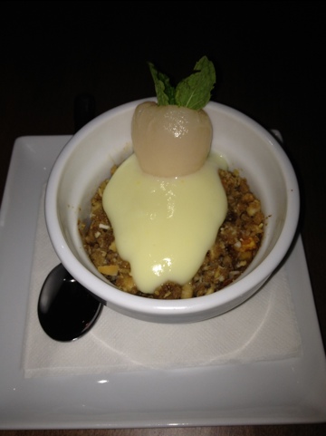 Rounding out the meal with two desserts that are both light and rich at the same time. Pandan Coconut Pannacotta, warm, toasted popcorn-like scented cream is topped with tapioca pearls, caramelized baby banana and brandy snap or Hot & Sweet Mango & Lychee Crumble – dense and moist crumble mixed with mango and topped with a lychee and cream.