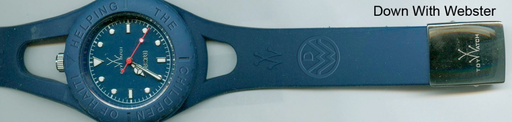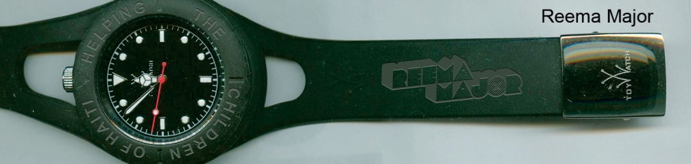 in 5 colours; lime-green, pink, dark blue, black and white, and has “Helping The Children Of Haiti” engraved on its bezel. With each watch the